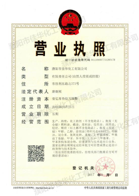 濮陽市佳華化工有限公司始建于1997年,公司注冊資金5300萬元,控股創建河南佳化能源有限公司,注冊資金1億元。目前,公司現有員工162人,其中中高級科研人員38人,占地面積160余畝,2015年實現銷售收入6.86億元,創匯2600萬元,已發展成為集研發、生產、銷售于一體的國家級高新技術企業。   成立19年來,公司積極與中國科學院、中國工程院、中國石化石油化工科學研究院、中國石油大學、華東理工大學等科研院所和高校合作,專業致力于煉油助劑、油品添加劑及高品質油品調合組分的研發與生產, 依托院士工作站研發平臺,瞄準科技前沿,致力于新型、環保煉油助劑和油品添加劑的研發與生產,取……